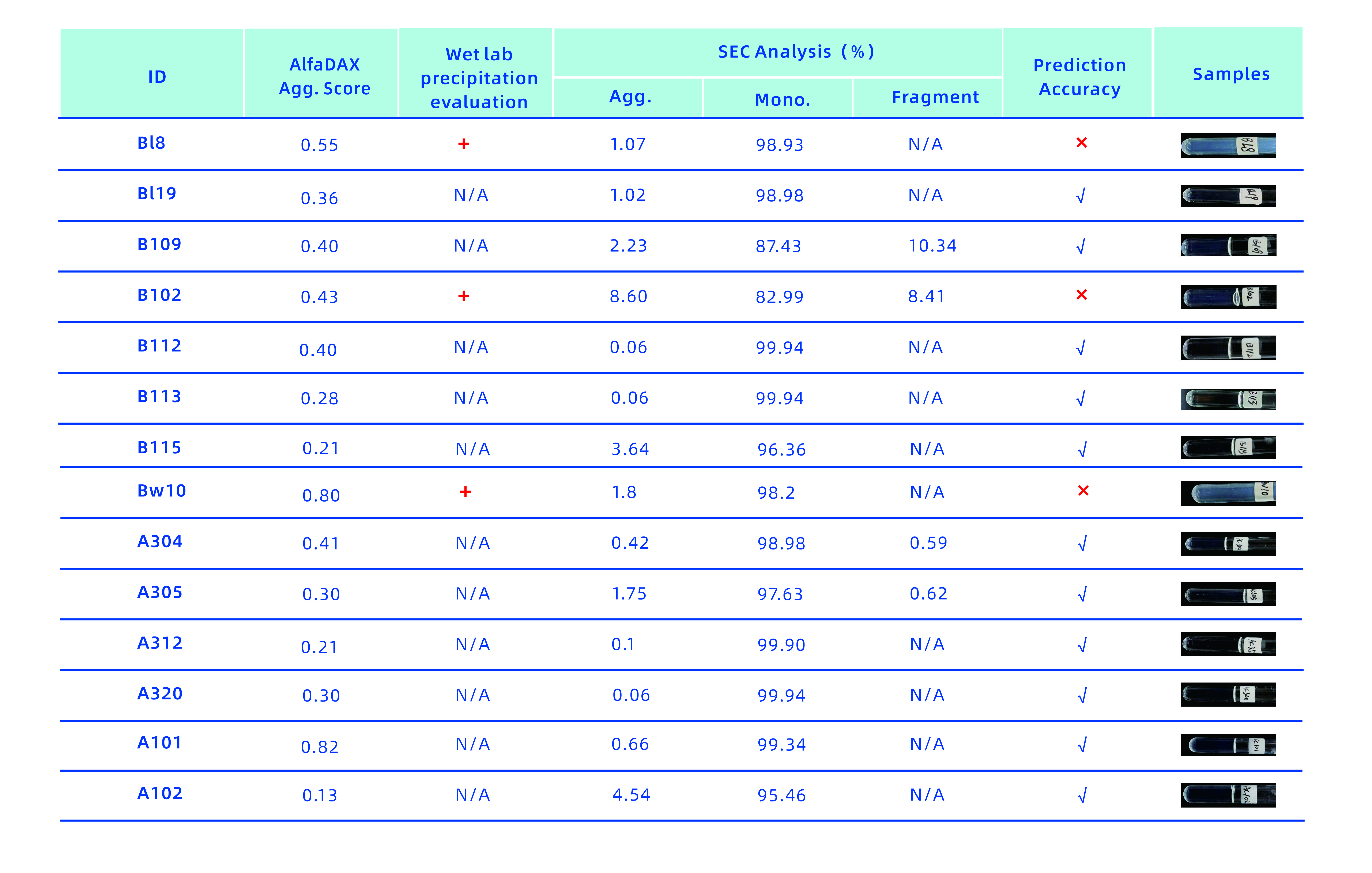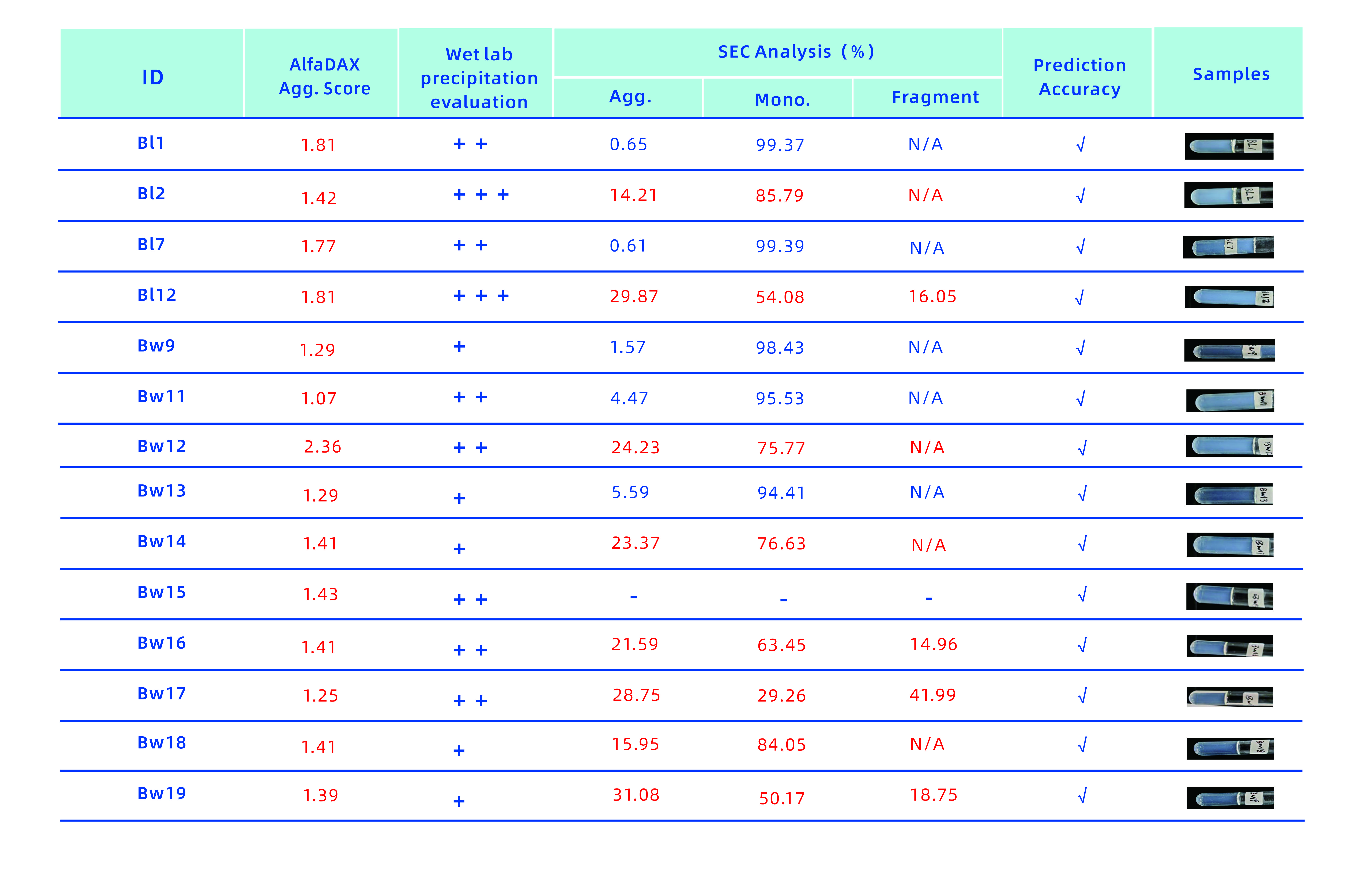 AlfaDAX system predicts the aggregation and precipitation of 28 innovative molecules with an accuracy rate of 89.5%, aiding customers in early risk mitigation through molecular modification and accelerating the new drug development process. Please feel free to try the online system and provide feedback to us.