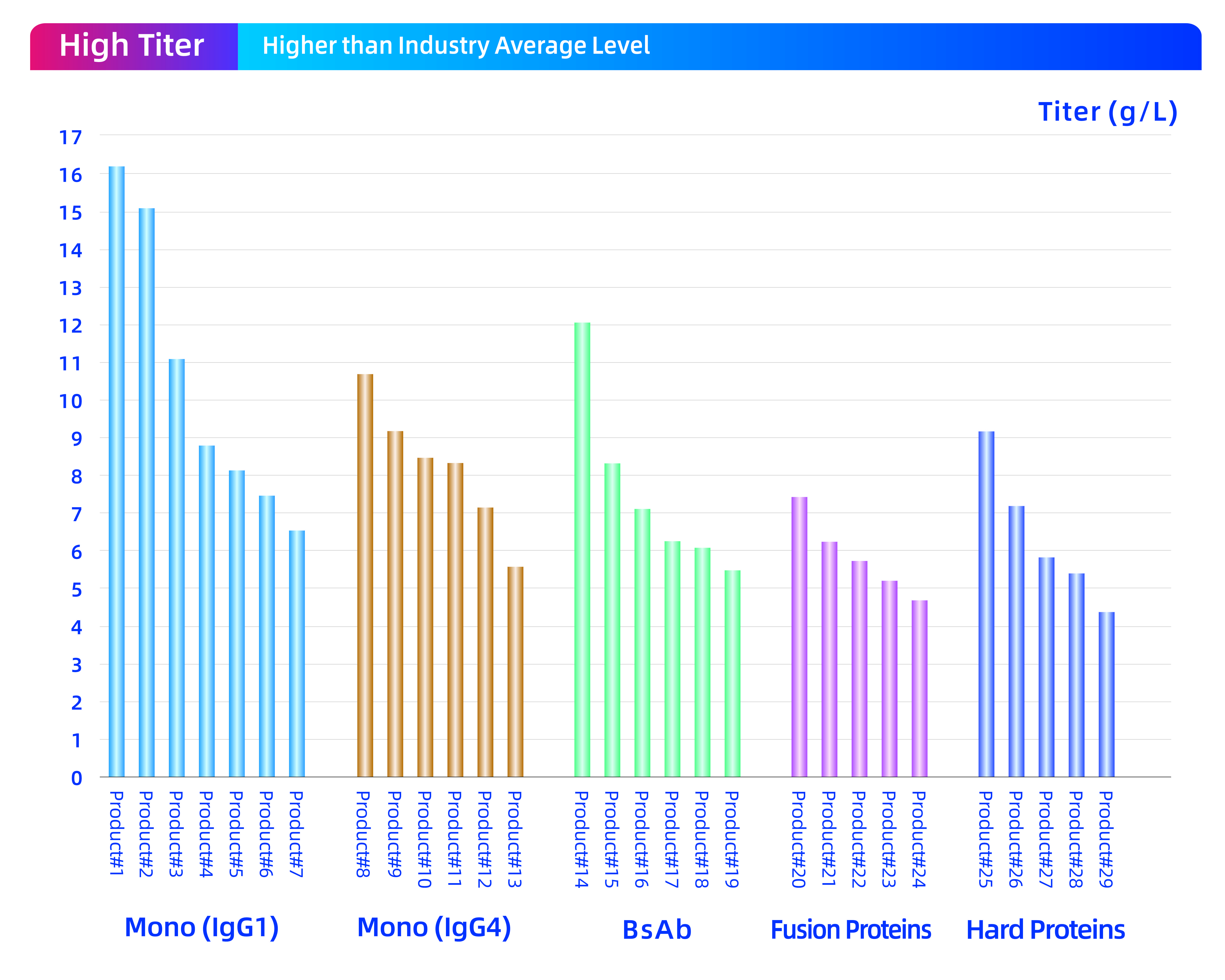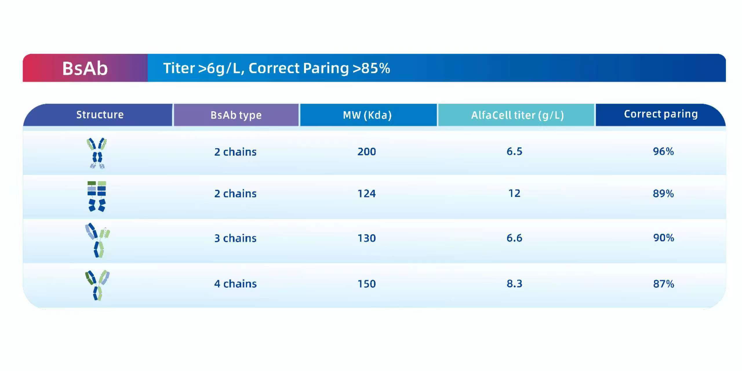 As the world’s first commercial site-specific cell line development platform, AlfaCell is not just utilized for internal R&D purposes, unlike Pfizer and Genentech. It widely applies to various products, including mAbs,BsAbs, fusion proteins, IVDs, and difficult-to-express proteins. Having delivered over 60 projects, AlfaCell’s platform consistently achieves higher yields and quality than industry averages. This includes mAb yields of 5–16g/L and BsAb yields of 5–12g/L, with mismatch rates below 20%.