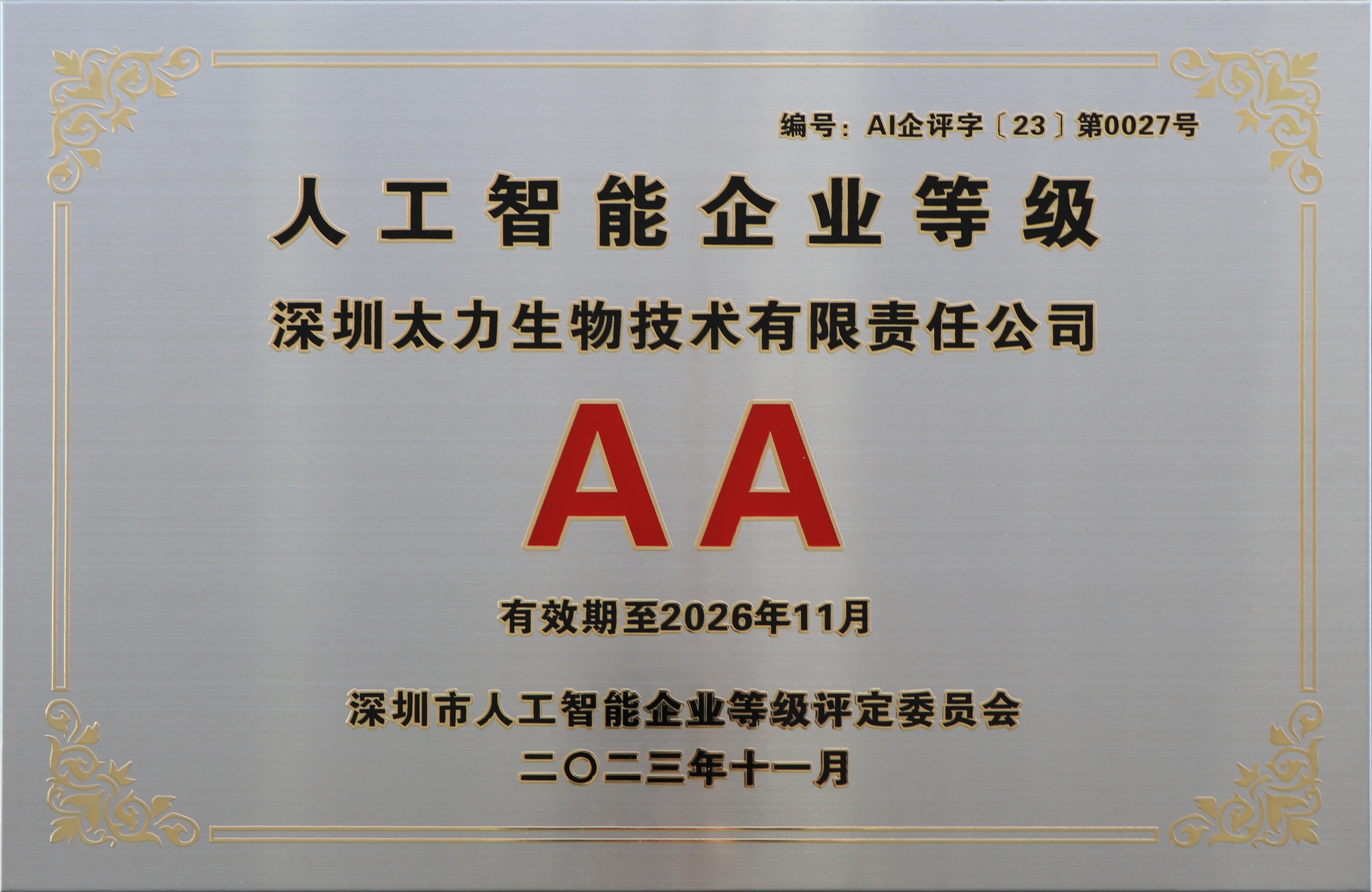 人工智能企业等级评定工作严格审核参赛企业在企业资格、创新能力、业务收入、产品服务、质量保证、企业诚信、经营环境等方面资质,组织评审专家组进行严格评审及实地核查。大湾生物全资子公司深圳太力生物技术有限责任公司经过多轮审查评定,获得2A级人工智能企业。