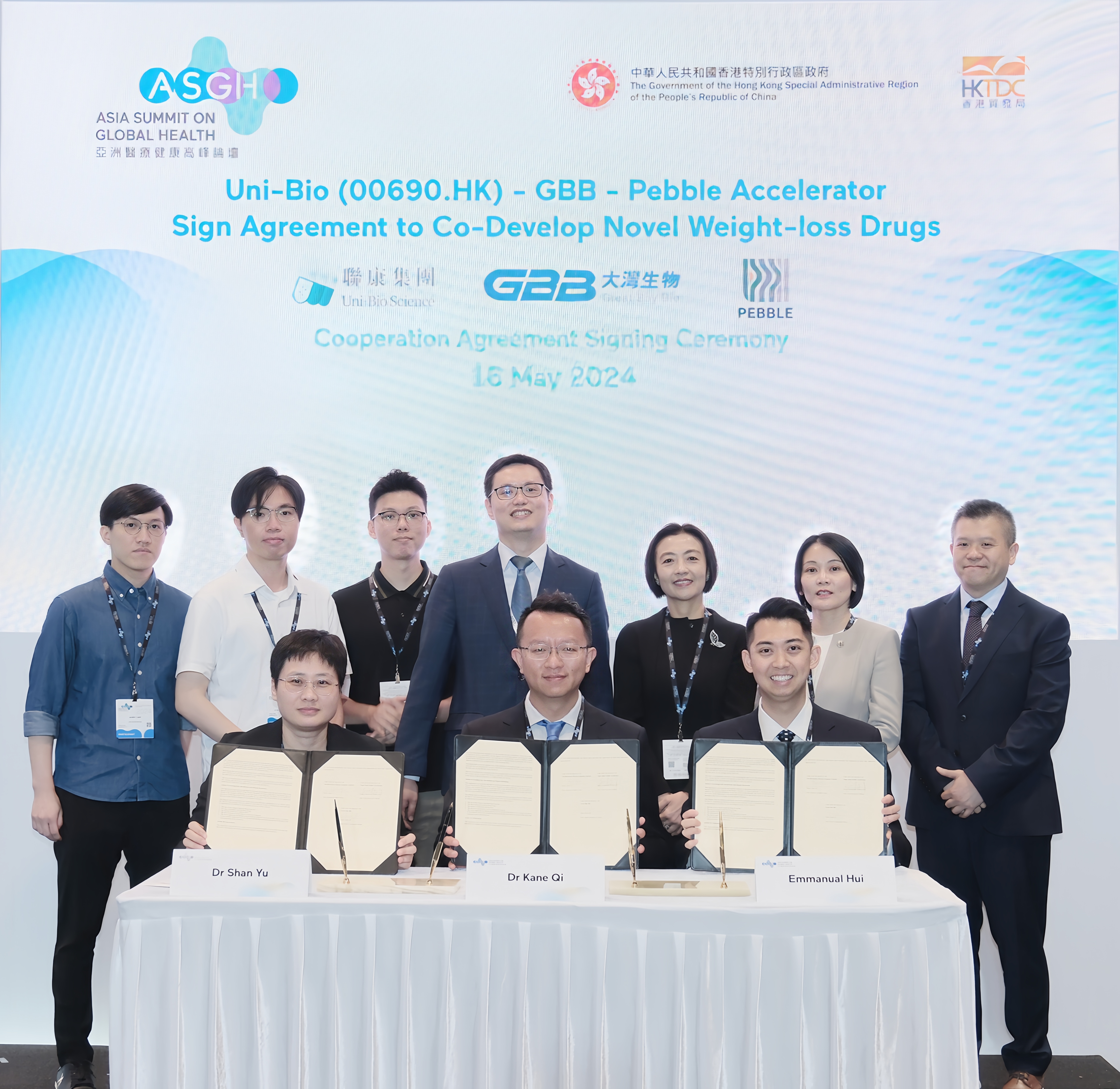 Great Bay Bio (hereinafter referred to as “GBB”), Pebble Accelerator (a subsidiary of Tigermed, hereinafter referred to as “Pebble”) and Uni-Bio Science Group Co., Ltd. (00690.HK, hereinafter referred to as “Uni-Bio”) officially signed a project cooperation agreement on jointly developing new weight loss drugs. The three parties will collaborate to innovate and build a complete ecological industrial chain of “Target discovery - Antibody generation - Druggability verification - Process development - Clinical pipeline stage – Commercialization”, and jointly explore and create a new therapeutic driving force for new target antibody drugs in the field of weight loss.Representatives from the Hong Kong Science and Technology Park (HKSTP), Hong Kong’s largest science and technology business incubation base, attended the event to witness this event.
