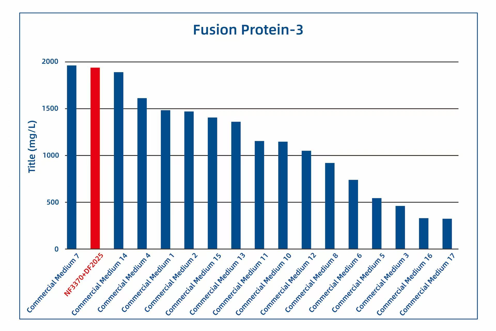 Since its launch, AlfaMedX (NF3370+DF2025) has received trial data from several of our customers. Comparative studies with 17 commercial media on cell line cultures for fusion proteins, mAbs, and BsAbs have demonstrated its significant advantages in protein yield and versatility. Trial data from 20 different cell lines showed that, compared to commercial media, GBB’s AlfaMedX (NF3370+DF2025) achieved expression levels at or above 90% of the top-performing commercial media in 9 cell lines, with its expression ranking consistently within the top 3.