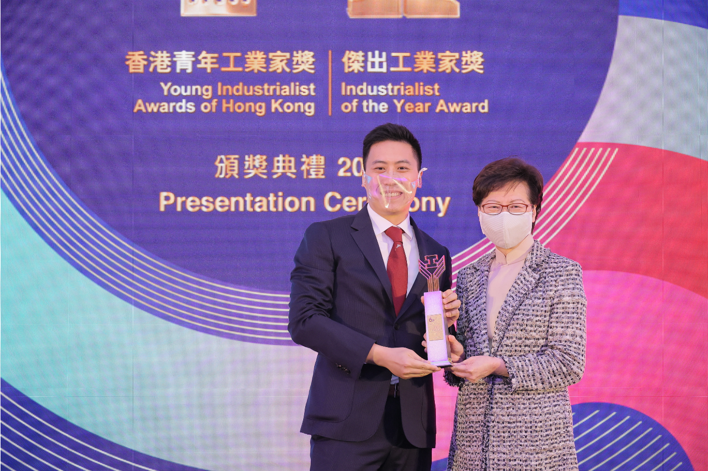 Mr. Kingsley Leung, Chairman of GBB, accepting the Young Industrialist Awards of Hong Kong 2020 from Mrs Carrie Lam, Chief Executive of Hong Kong